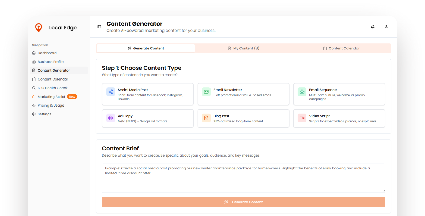 Turn your strategy into ready-to-use marketing. Local Edge writes on-brand posts, emails, blogs, and ads designed to grow your audience.